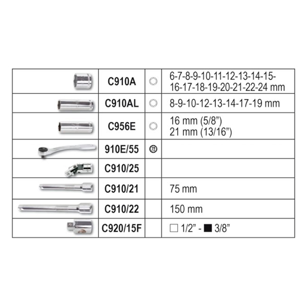- C910AL: 8-9-10-12-13-14-17-19mm