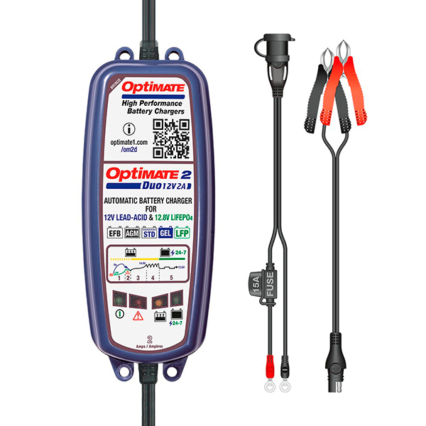 Das OptiMate 2 Duo Ladegerät ist die ideale Option, um die Batterie Ihres Motorrads zu warten oder aufzuladen, egal ob Blei, AGM, Gel oder sogar Lithium, mit einem Ladestrom von 2A, der das Laden mittelgroßer Batterien ermöglicht.