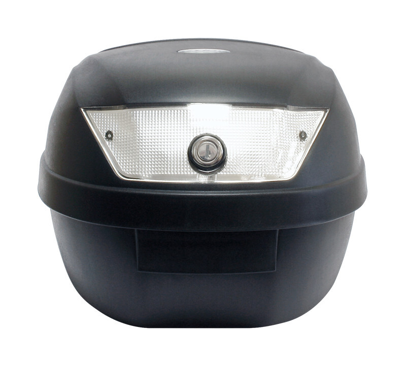 Der Koffer 28 Liter schwarz mit Ankerklappen für allgemeine Verwendung, mit der Fähigkeit, einen Helm aufzunehmen, mit einem silbernen Catadioptrikum.