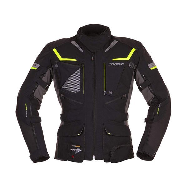 Neuartige Ausführungen für die Cordura Modeka Panamericana Bikerjacke mit herausnehmbarem Thermofutter und Sicherheitsnähten. Zu dieser Motorradjacke gehört auch die abnehmbare Sympatex- Membran (45.000 mm Wassersäule), die zu 100% wasserdicht, zu 100% winddicht und atmungsaktiv ist, wodurch ihre Vielseitigkeit erhöht wird und sie das ganze Jahr über verwendet werden kann.
