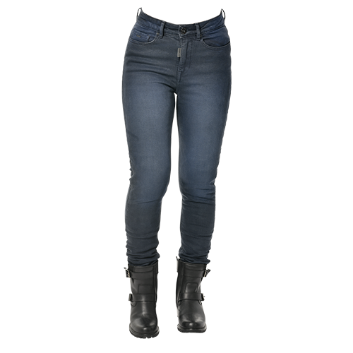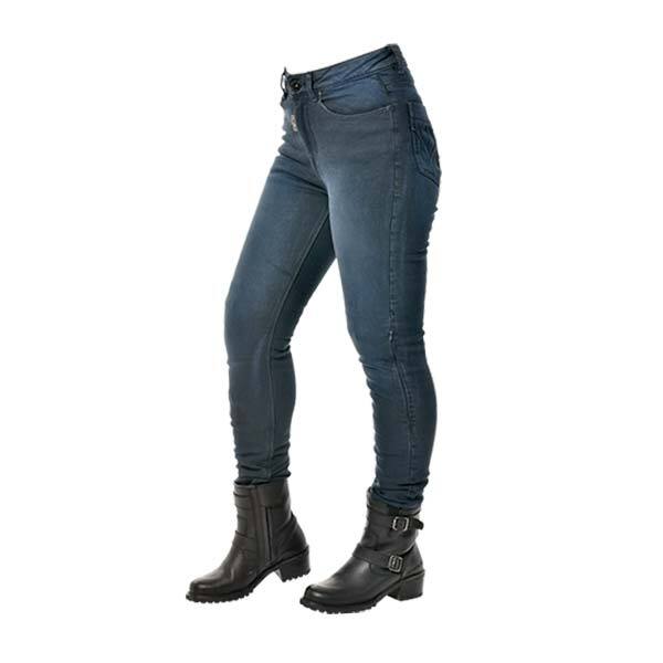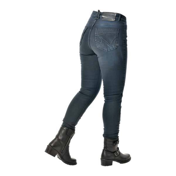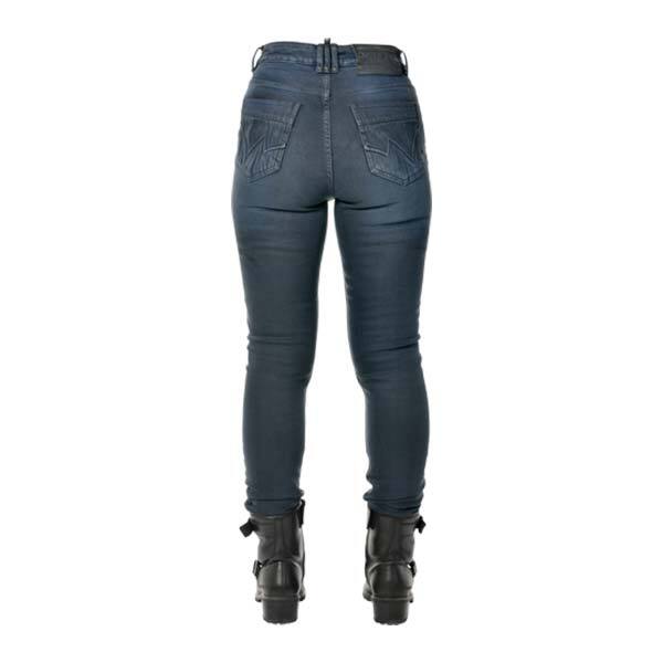 Zeitlose OverLap Jessy Ultra Damen-Motorradhose. Es enthält das Nyco-Sanity-Gewebe, eine Mischung aus unterbrochenen Nylon- und Baumwollfasern, die eine höhere Abrieb- und Reißfestigkeit ermöglicht. Einlagige Jeans, ideal für das ganze Jahr.