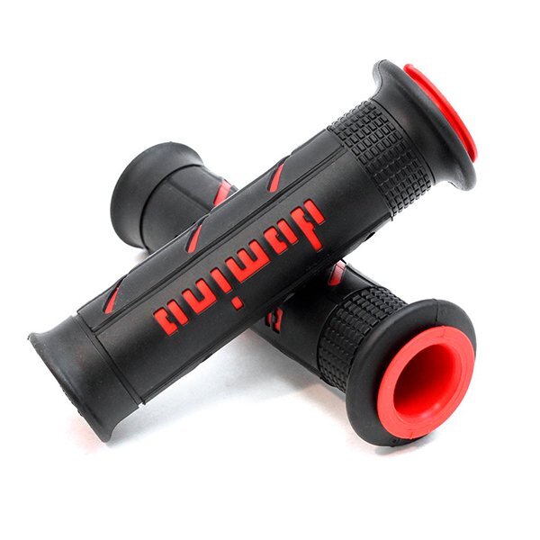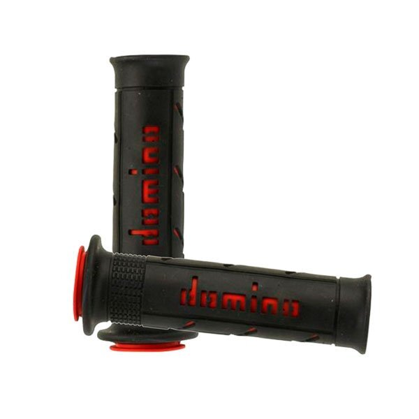 Domino Motorradgriffe Set Modell XM2 in schwarz und rot, speziell für 22mm Lenker. Diese Manschetten bieten eine weiche Verbindung.