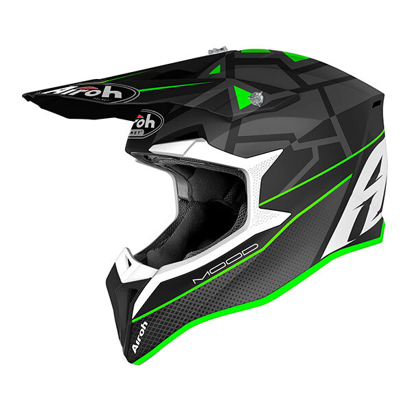 Aggressive Grafik für den Airoh Wraap Mood Motocross Helm. Das innovative EPS-System mit doppelter variabler Dichte erhöht die Sicherheitsstandards, genau wie ein High-End-Helm.