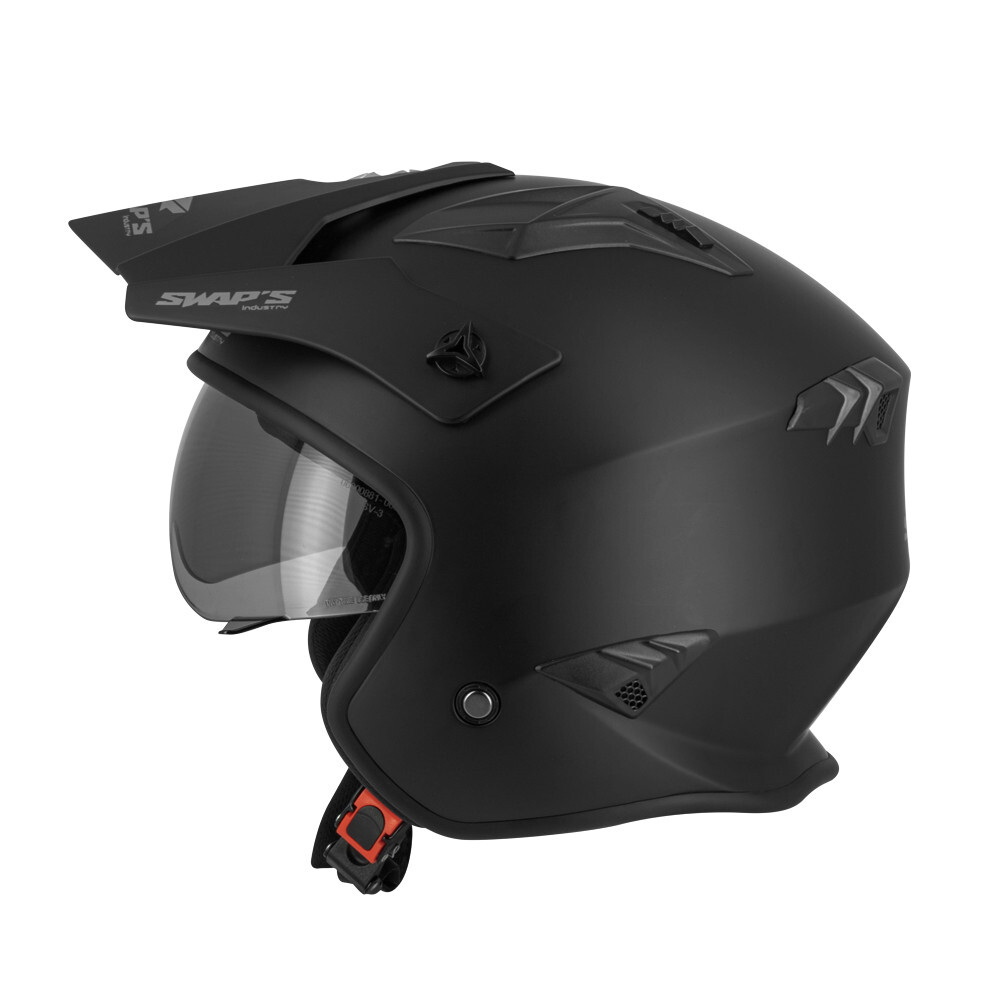 Trial-Schutzhelm Typ Jet Swaps S769 Trooper schwarz Matte, ein unisex Schutzhelm aus thermoplastischer Resina mit schnellem Verschluss, inklusive Sonnenbrille und matte Oberfläche, ECE 22-06 zertifiziert.