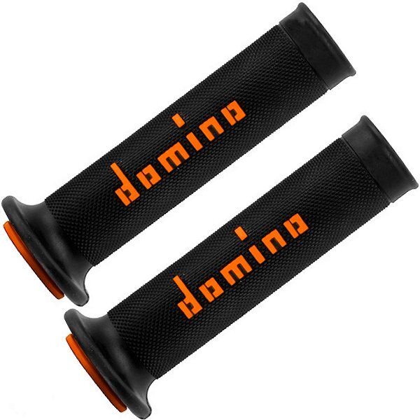 Set universelle Domino Griffe für Motorräder in schwarz und orange. Satz Universalgriffe für Lenker von 22 an den Enden offen