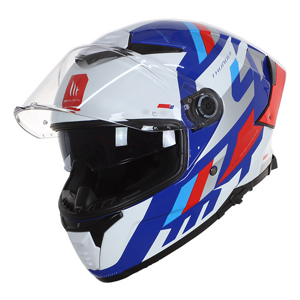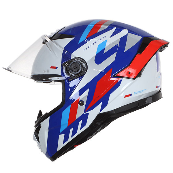 Aerodynamischer Helm mit MT FF118SV Thunder 4 SV Ergo Sonnenblende, das 2,2 mm dicke und sehr breite kratzfeste Polycarbonat-Visier bietet ein außergewöhnliches Sichtfeld in der Fahrposition. Das Visiermechanismus-System der neuen Generation ermöglicht ein werkzeugloses und sekundenschnelles Abnehmen des Visiers . Prädisposition;n für Pinlock-Klinge (nicht im Lieferumfang enthalten).