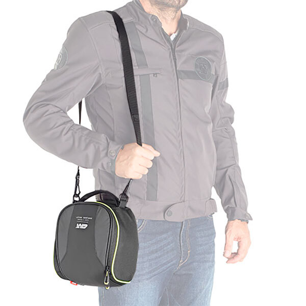 Tankrucksack von Givi mit einem Fassungsvermögen von fünf Litern, einem Griff zum Tragen in der Hand und einer wasserabweisenden Hülle in fluoreszierendem Gelb.