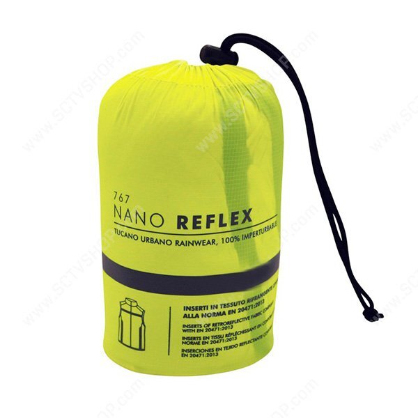 Fluoreszierende Windbreaker- Motorradweste mit schwarzen Tucano Nano Reflex- Seiten, die leicht zu verdichten ist und sich perfekt zum Tragen auf jeder Art von Jacke anpasst.
