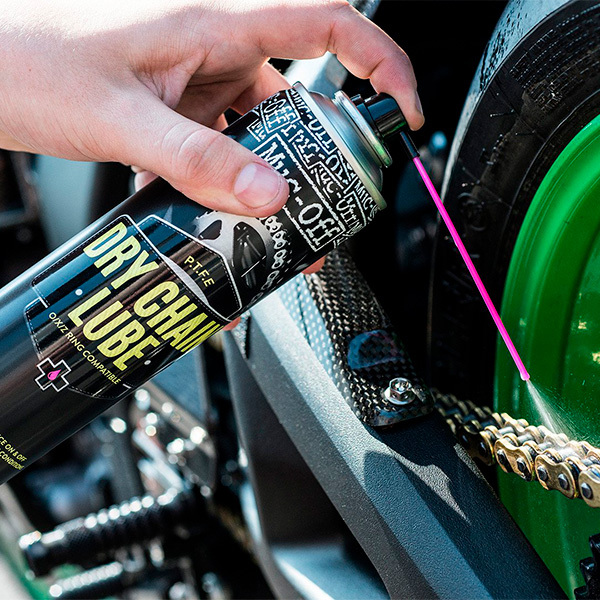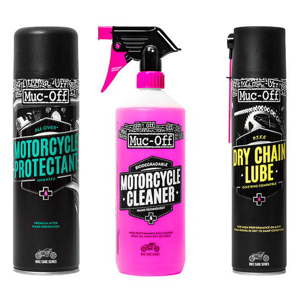 Muc Off Reinigungsset für Motorräder. Mit diesem Sortiment können Sie Ihr Motorrad schonend reinigen, die Kunststoffteile behandeln und schützen und Ihre Kette mit Muc-Off Sprühschmiermittel schmieren.