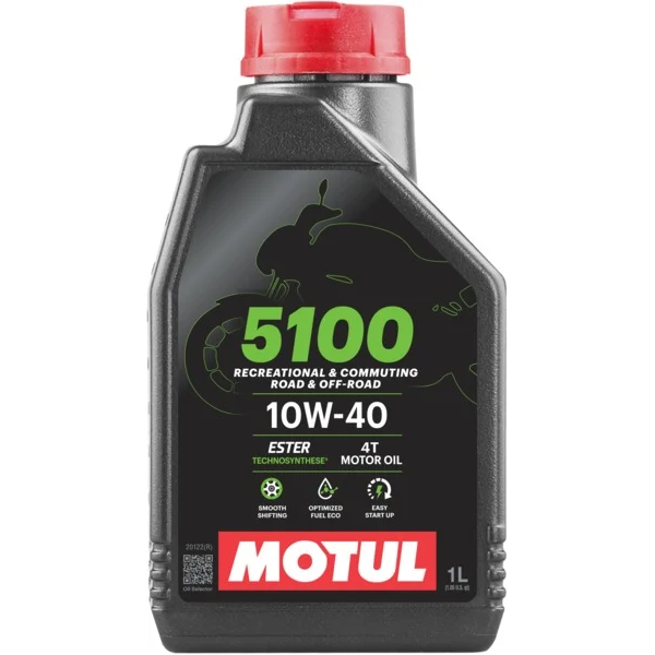 Motul 5100 Motorradöl mit einer Dichte von 10W40 für 4-Takt-Motoren, Produkt verpackt in einem 1-Liter-Behälter gemäß JASO MA2-Vorschriften. Motul 5100 10w40 Öl wird für Straßen- und Stadtmotorräder, Trail-, Cross- oder Enduro-Motorräder verwendet.