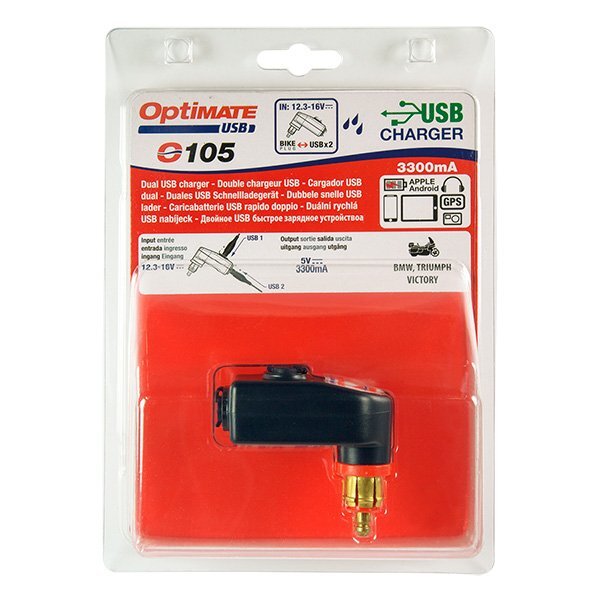 Der abgewinkelte DIN-zu-USB-Anschlussadapter OptiMate O-105 verfügt über zwei USB-Buchsen, über die Sie Ihr Smartphone an Ihrem BMW, Triumph, Ducati Multistrada-Motorrad aufladen können
