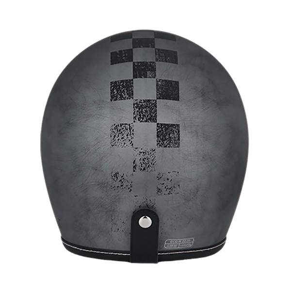 Beeindruckende Dekorationen des prächtigen, abgenutzten Origine Primo Scacco Jet-Helms, perfekt für Städter, die ihren Cafe Racer-, Vintage- oder Custom-Stil beibehalten möchten.