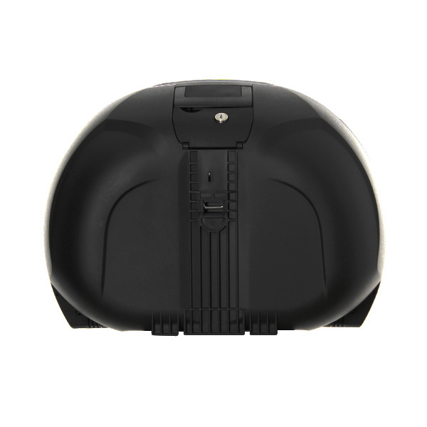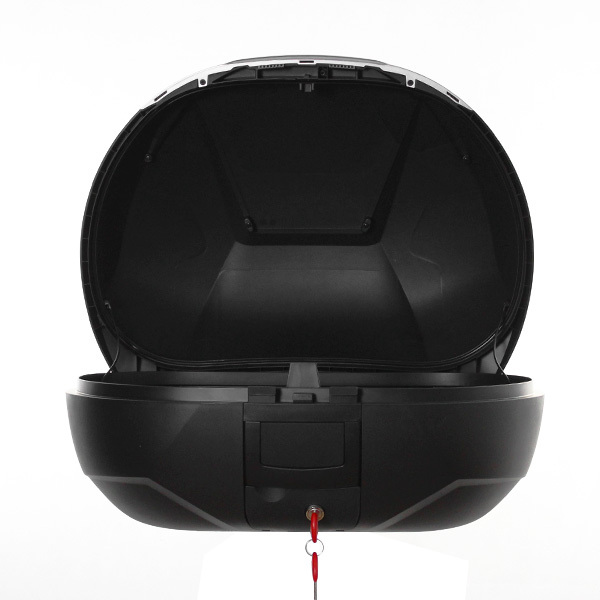 Ein robuster Motorradkoffer aus hochwertigem, verstärktem Polypropylen, der die Gegenstände im Inneren vor Regen oder Schnee schützt.