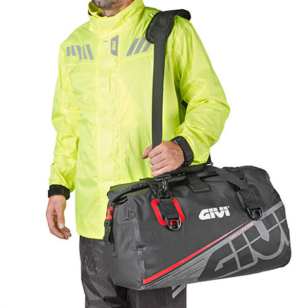 Mit einem Rollverschlusssystem, das IPX5-Wasserdichtigkeit garantiert, einem Schultergurt und einem Handgurt.