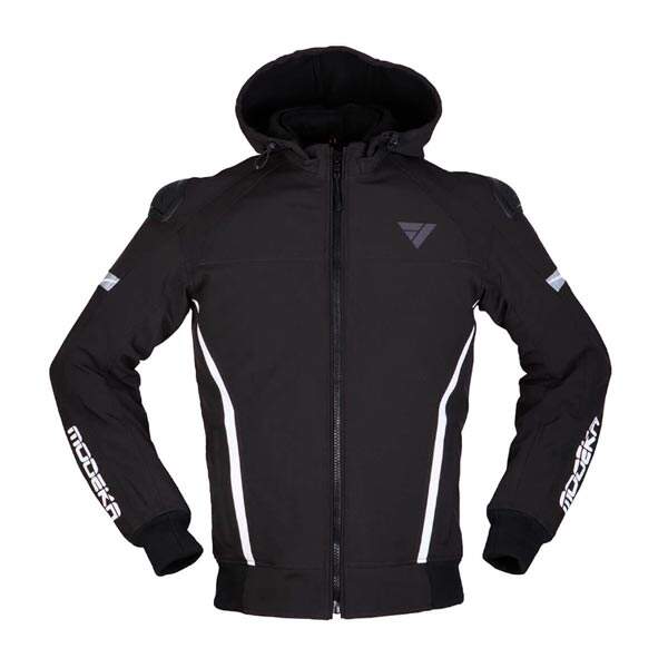 Vielseitige und funktionelle Motorrad-Textiljacke mit Kapuze Modeka Clarke Sport (Windbreaker-Typ). Es enthält ein vollständig herausnehmbares Thermofutter, um den Komfort und die Wärme des Kleidungsstücks zu erhöhen, das sowohl für Stadt- als auch für Straßenfahrten geeignet ist.