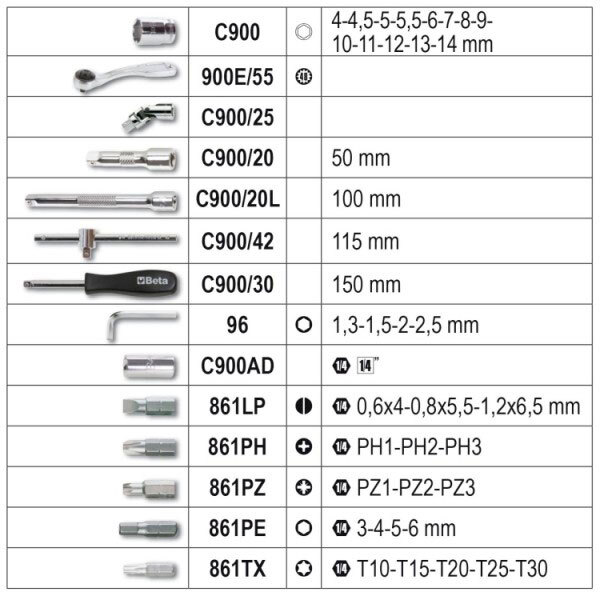 Sortiment an Beta 903E C42 Ratschen mit 13 Sechskantbuchsen, 18 Schraubendreherbits, 4 Sechskantschlüsseln und 7 Zubehörteilen in einem Kunststoffgehäuse. Ref 009031042