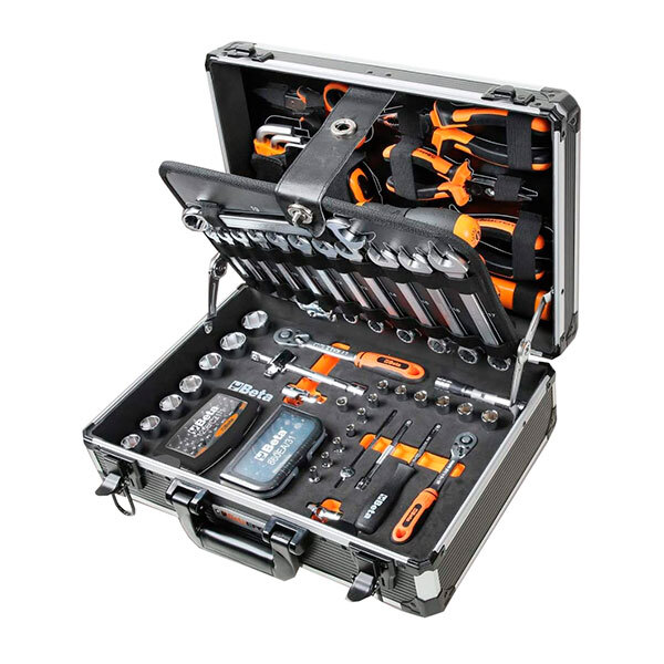 Beta- Aktentasche mit einer Auswahl an 1/4 und 3/8 Ratschenschlüsseln sowie zahlreichen Zangen, Schraubendrehern, flachen Schlüsseln und Zubehör, die Sie zweifellos aus mehr als einem Problem herausholen, das in jeder Motorradwerkstatt und Garage unerlässlich ist.
