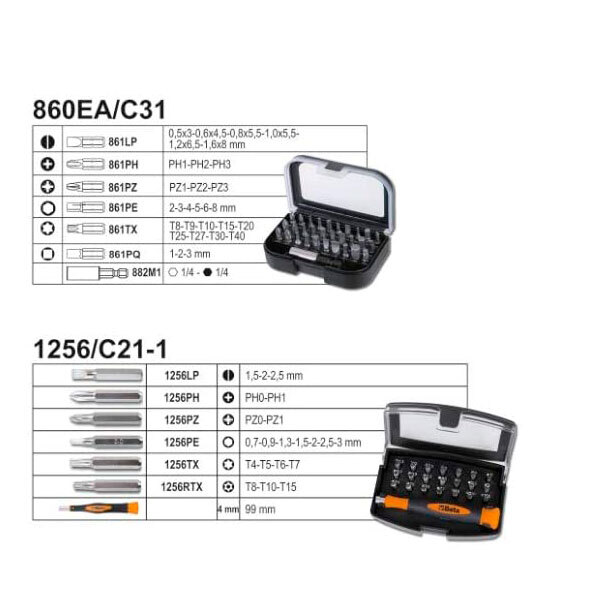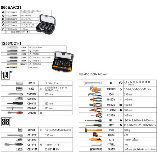 Auswahl von 128 Beta-Werkzeugen mit 1/4 Ratschen, 3/8 Flachschlüsseln, Schraubendreher, Zange und verschiedenen Bits. Ref 020540012